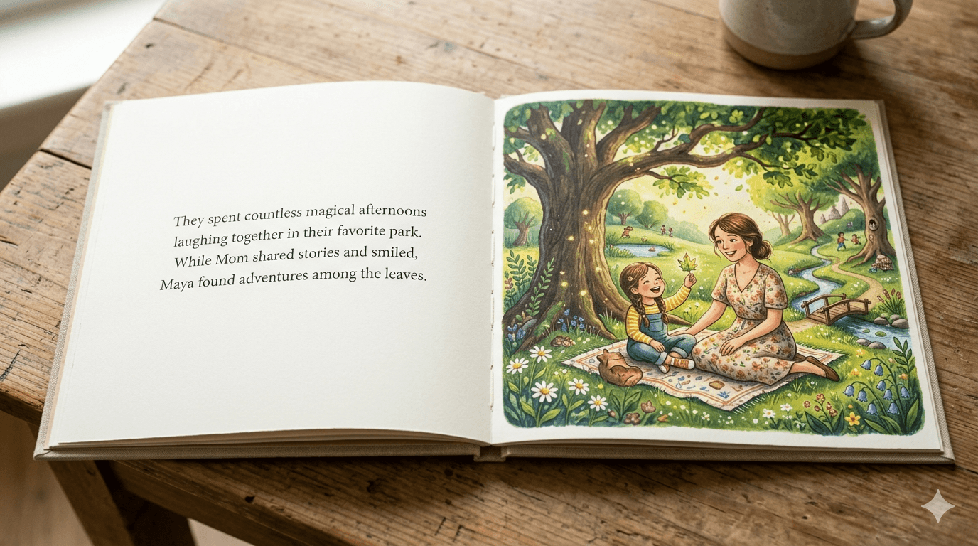 “To Mom — thank you for making everyday moments feel magical. From bedtime songs to park adventures, your love is woven into so many of our favorite memories. We made this book so you could hold onto them forever.”